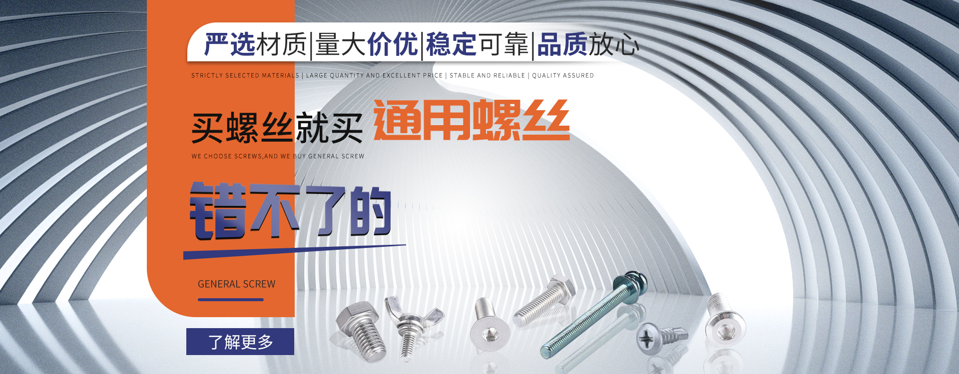中山市通用螺絲制造有限公司成立于1987年,工廠坐落于廣東四小虎之一的中山市,北連廣州,毗鄰港澳。總占地面積14000m 2,足有兩個足球場。我司于1998年通過德國萊茵TUV ISO9002認證,于2002年通過TUV ISO9001:2000認證。2008年通過ISO 14000認證。我司主營自攻螺絲、組合螺絲、機械螺絲、防松螺絲等標準和非標準件,我司既可按客戶的要求提交所需的產品,也可以為客戶量身定做所需產品。我司擁有專業的產品檢測隊伍和投影分析儀、金相、硬度計(韋氏和洛氏)、扭矩力測試計等完善的檢測設備,為電子、電器、五金塑料、衛(wèi)浴、家具、機械、汽配等行業提供符合歐盟質量、環(huán)保要求的產品。2006年,我司自主開發(fā)的ERP管理系統,使我們的生產和服務效率得到了極大的提高。 經過三十多年地摸爬滾打,依靠眾多新老顧客的支持,通用螺絲逐漸成長為國內知名的緊固件供應商。了解更多 >>